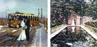 I love the picture on the left! There's just something about it. It looks like the couple was at an old Hollywood party and stepped out for a minute into the night air.